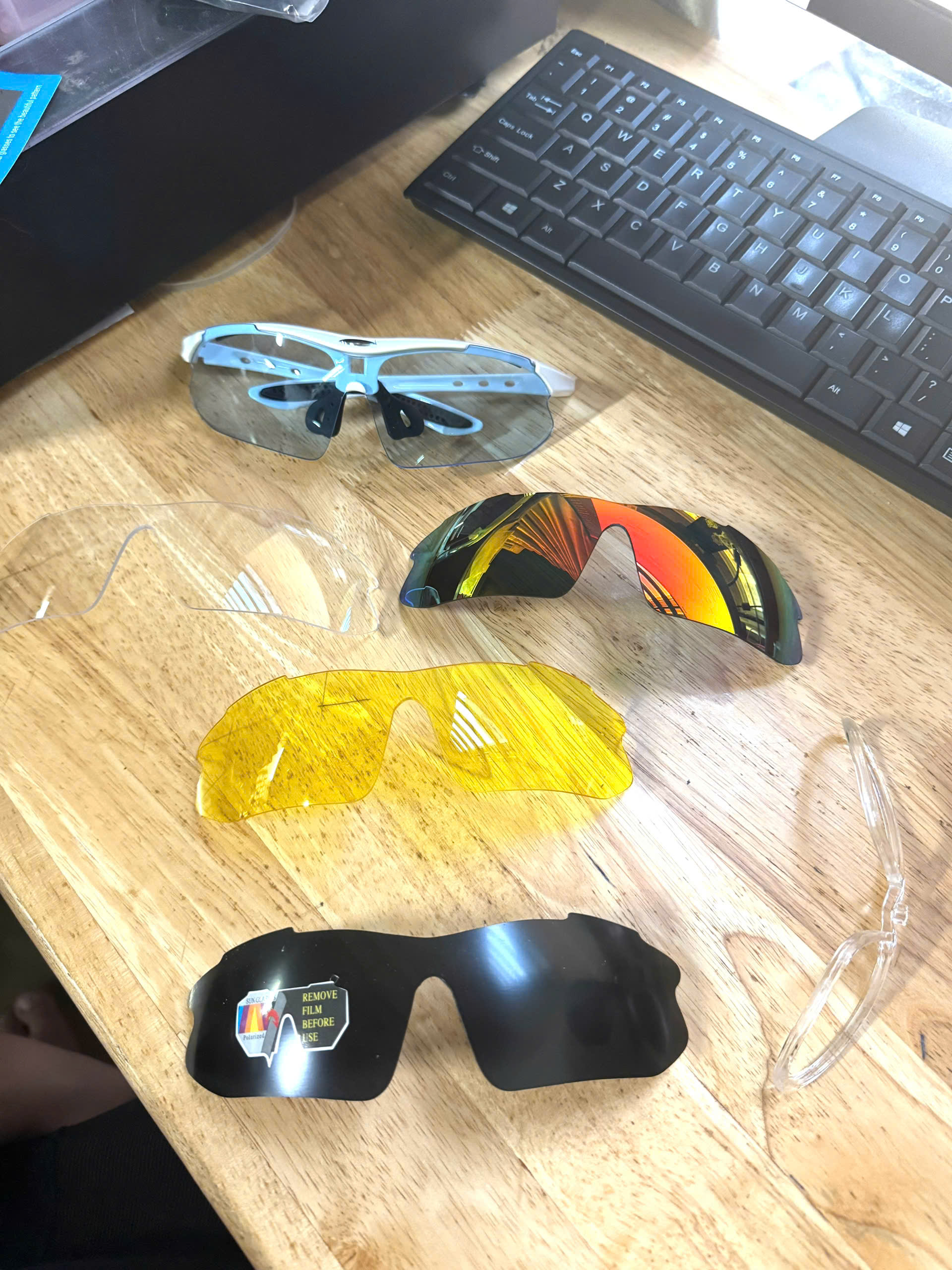 Bộ kính thể thao pickleball trong nhà/ ngoài trời 5 tròng mắt. Bộ kính bao gồm mắt đen phân cực, mắt phản quang chống chói, mắt vàng đi tối, chống sương…