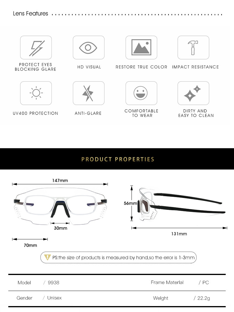 Thông tin Kính Chơi Pickleball Tennis Siêu Nhẹ Mắt Trắng UV400 Đổi Màu Xám Khi Ra Nắng – Có Tròng Gắn Mắt Cận Viễn Loạn – Đen